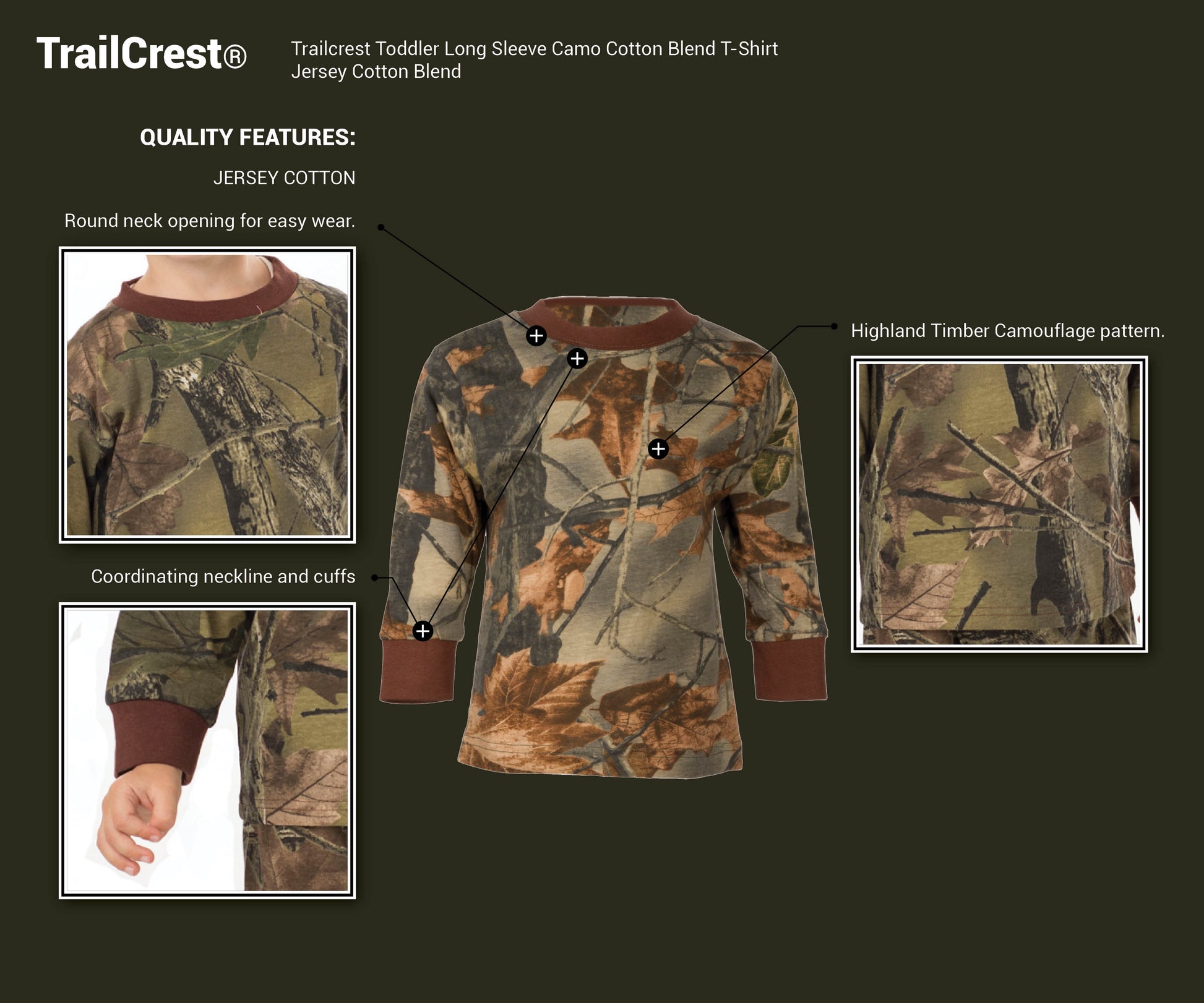 - STYLE: Long sleeve camo cotton t-shirt with coordinating brown trim around neck and cuffs. It will definitely become your child’s favorite outfit!